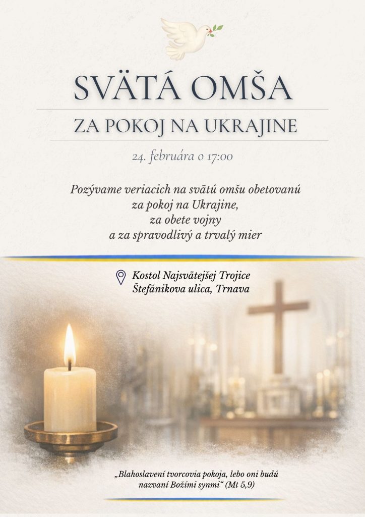 V utorok 24. februára 2026 bude v trnavskom jezuitskom kostole na Štefánikovej ulici večerná sv. omša o 17. hodine obetovaná za pokoj na Ukrajine, za obete vojny a za spravodlivý a trvalý mier. V duchu Ježišových slov: „Blahoslavení tvorcovia pokoja, lebo oni budú nazvaní Božími synmi“ (Mt 5,9) vás pozývame spoločne sa stíšiť v modlitbe a vyjadriť spolucítenie, bratskú lásku a solidaritu s trpiacimi.