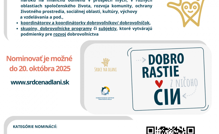Ešte do budúceho pondelka, t. j. do 20. októbra polnoci, máte možnosť navrhnúť na ocenenie Srdce na dlani 2025 v Trnavskom kraji dobrovoľníkov, dobrovoľníčky, koordinátorov dobrovoľníkov, projekty, programy alebo subjekty podporujúce rozvoj dobrovoľníctva.