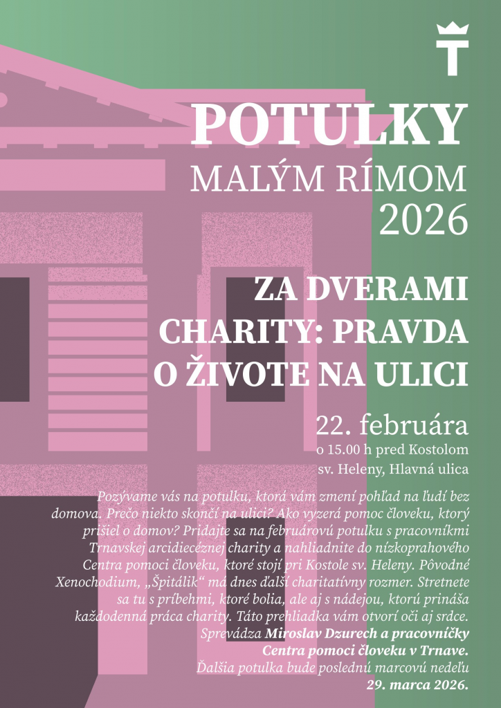 Potulka s názvom Za dverami charity: Pravda o živote na ulici sa začne v nedeľu 22. februára o 15.00 h na Hlavnej ulici, pred budovou niekdajšieho Xenodochia, známeho ako Špitálik, kde sa v minulosti mníšske rehole starali o ťažko chorých a umierajúcich chudobných obyvateľov mesta. Odtiaľ sa účastníci presunú do Centra pomoci človeku, do ktorého vstúpia rovnakou cestou ako ľudia bez domova. Prehliadka ich prevedie priestormi vrátnice, jedálne, práčovne aj hygienického zázemia a priblíži im každodenné fungovanie tohto nízkoprahového zariadenia pri Kostole sv. Heleny.