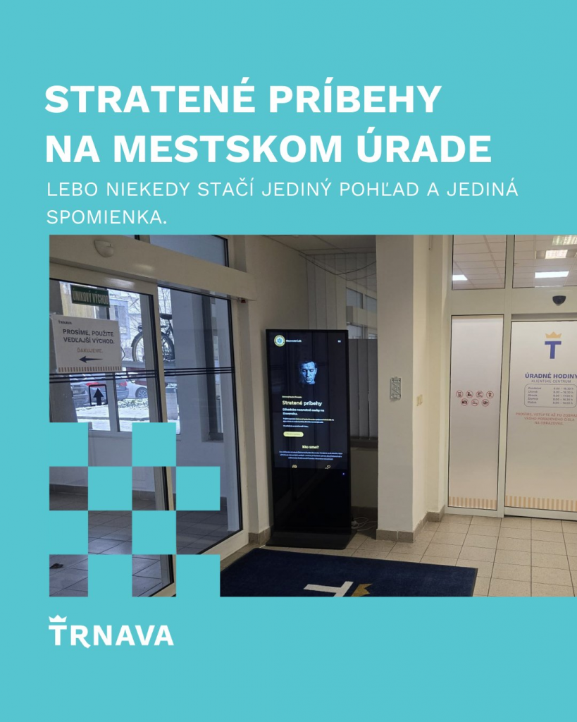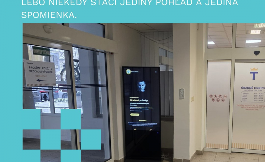 Na Mestskom úrade v Trnave sme koncom minulého roka umiestnili LED panel, na ktorom beží projekt STRATENÉ PRÍBEHY. Zobrazuje pátrania po nezvestných ľuďoch a prosbu o pomoc s identifikáciou či spoznaním osoby.